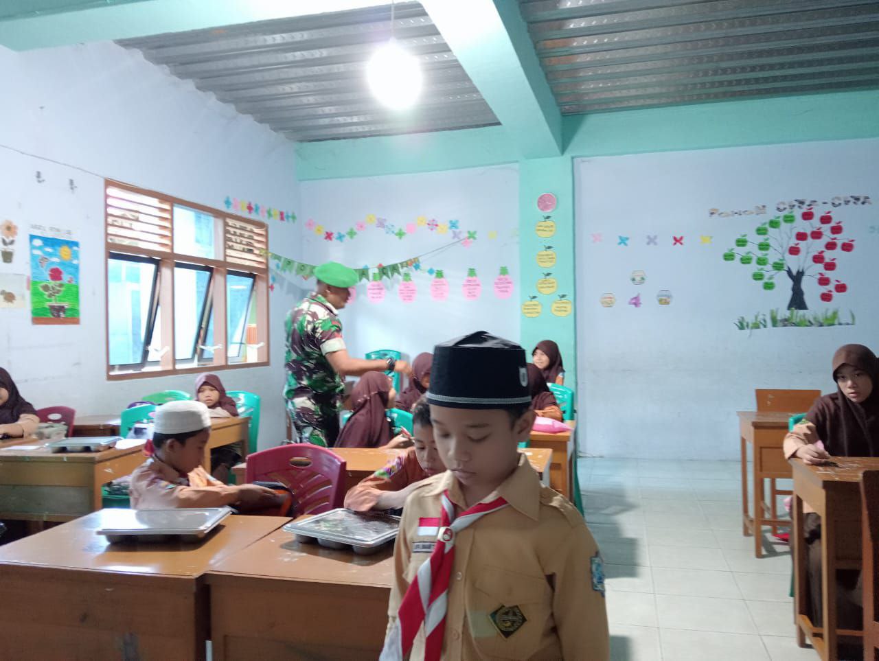 Babinsa juga menjelaskan bahwa pendampingan ini bertujuan memastikan kelancaran pembagian makanan sekaligus memberikan edukasi kepada para siswa mengenai pentingnya pola makan sehat.
