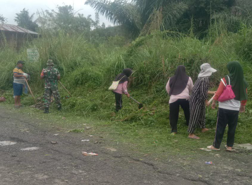 Babinsa bersama para warga dengan semangat sambil bercanda ria membersihkan dan membabat rumput di kiri dan kanan jalan sehingga terlihat rapih dan bersih