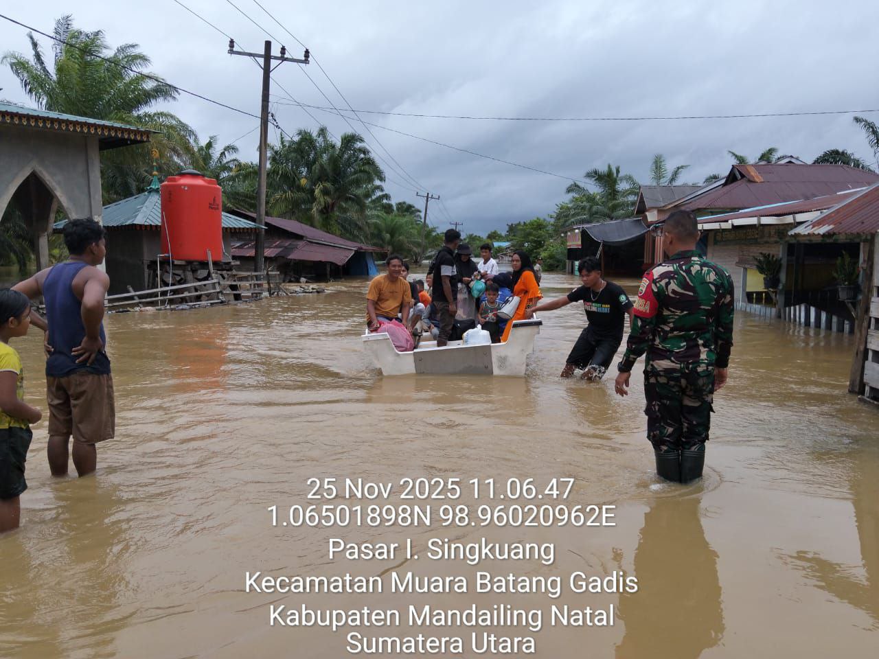 Muara Batang Gadis – Koramil 17/Natal Kodim 0212/Tapsel dipimpin langsung Danramil Lettu Inf Eman Sutrisno menunjukkan komitmennya dalam membantu masyarakat dengan terjun langsung ke lokasi banjir di Desa Singkuang I Kecamatan Muara Batang Gadis Kabupaten Natal, Selasa (25/11/2025). Evakuasi dilakukan bersama aparat setempat menyusul tingginya curah hujan yang memicu genangan air hingga 50-80 cm di sejumlah permukiman warga.