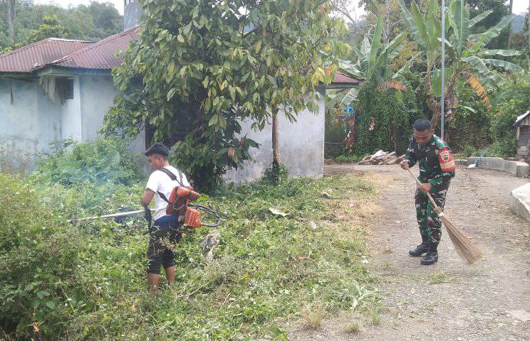 Babinsa bersama perangkat desa turun langsung bersama warga, bahu-membahu membersihkan sampah dan rumput liar yang berpotensi mengganggu kebersihan dan kesehatan lingkungan